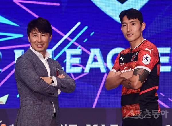 28일 서울 마포구 상암동 누리꿈스퀘어에서 열린 ‘K리그 파이널라운드 미디어데이’에서 포항 김기동 감독과 신진호가 포즈를 취하고 있다.