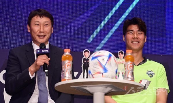28일 서울 마포구 상암동 누리꿈스퀘어에서 열린 ‘K리그 파이널라운드 미디어데이’에서 전북 김상식 감독과 송범근이 취재진의 질문에 답하며 웃고 있다.