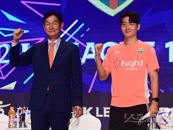 28일 서울 마포구 상암동 누리꿈스퀘어에서 열린 ‘K리그 파이널라운드 미디어데이’에서 강원FC 최용수 감독과 김동현이 포즈를 취하고 있다.