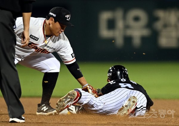 28일 대전 한화생명이글스파크에서 ‘2022 신한은행 SOL KBO리그’ 한화 이글스와 LG 트윈스의 경기가 열렸다. 4회초 2사 1루에서 한화 김태연이 2루 도루를 시도하던 LG 1루 주자 문성주를 태그 아웃시키고 있다.