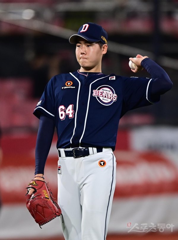 28일 경기도 수원KT위즈파크에서 열린 ‘2022 신한은행 SOL KBO리그’ KT 위즈와 두산 베어스의 경기에서 4회말 1사 1루 KT에 연속 안타를 허용한 두산 최승용이 아쉬워하고 있다.