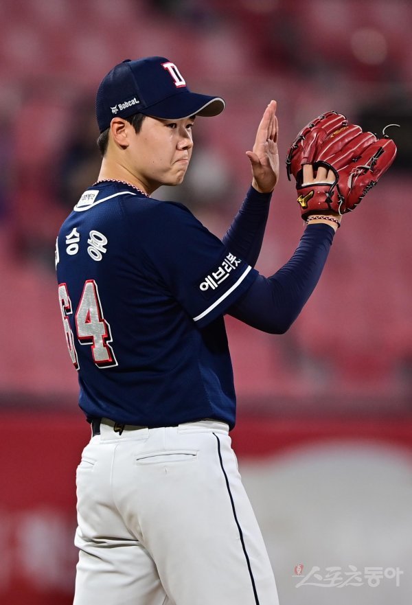 28일 경기도 수원KT위즈파크에서 열린 ‘2022 신한은행 SOL KBO리그’ KT 위즈와 두산 베어스의 경기에서 3회말 1사 KT의 내야 땅볼 때 두산 최승용이 수비수를 향해 손뼉을 치고 있다.