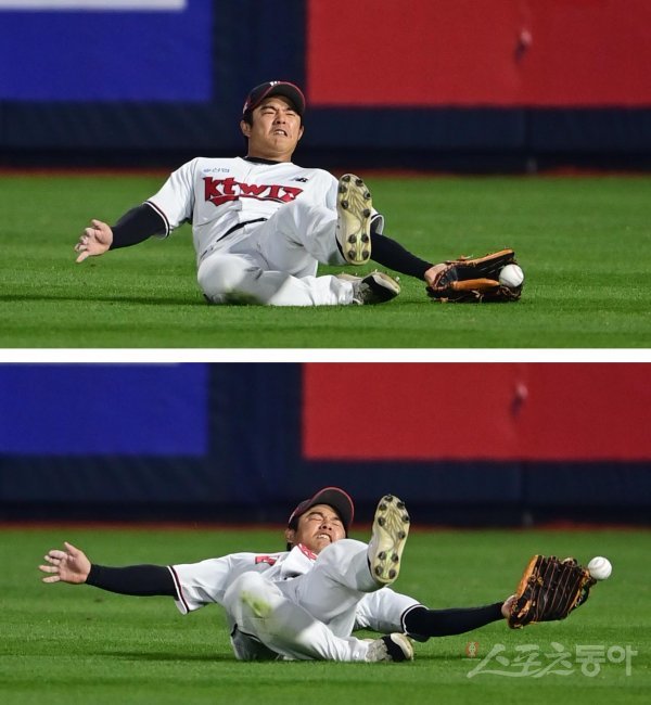28일 경기도 수원KT위즈파크에서 열린 ‘2022 신한은행 SOL KBO리그’ KT 위즈와 두산 베어스의 경기에서 1회초 무사 두산의 우전 2루타를 KT 조용호가 놓치고 있다.