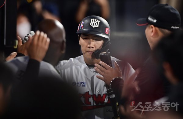 28일 경기도 수원KT위즈파크에서 열린 ‘2022 신한은행 SOL KBO리그’ KT 위즈와 두산 베어스의 경기에서 2회말 2사 2루 KT 오윤석이 선제 중월 투런 홈런을 친 후 더그아웃에서 동료들의 축하를 받고 있다.