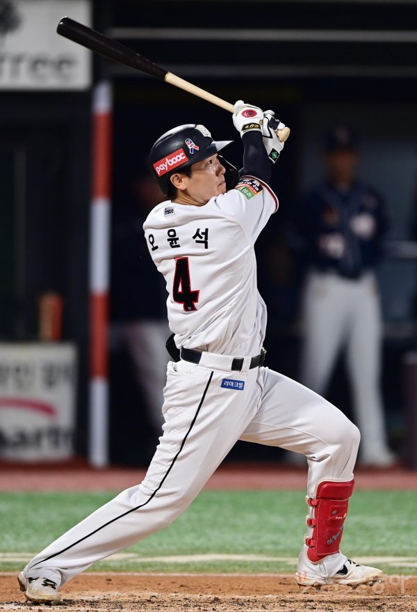 28일 경기도 수원KT위즈파크에서 열린 ‘2022 신한은행 SOL KBO리그’ KT 위즈와 두산 베어스의 경기에서 2회말 2사 2루 KT 오윤석이 선제 중월 투런 홈런을 치고 있다.