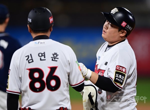 28일 경기도 수원KT위즈파크에서 열린 ‘2022 신한은행 SOL KBO리그’ KT 위즈와 두산 베어스의 경기에서 4회말 1사 1루 KT 김준태가 중전 안타를 친 후 1루코치와 주먹을 맞대고 있다.
