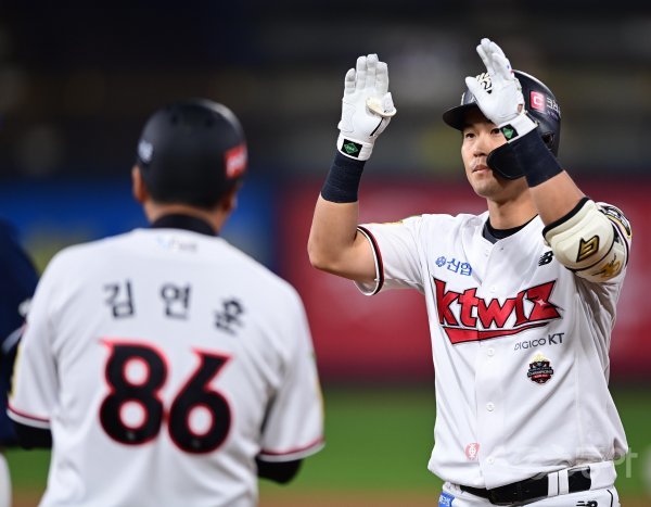 28일 경기도 수원KT위즈파크에서 열린 ‘2022 신한은행 SOL KBO리그’ KT 위즈와 두산 베어스의 경기에서 4회말 1사 1, 3루 KT 배정대가 1타점 중전 적시타를 친 후 더그아웃을 향해 세리머니하고 있다.