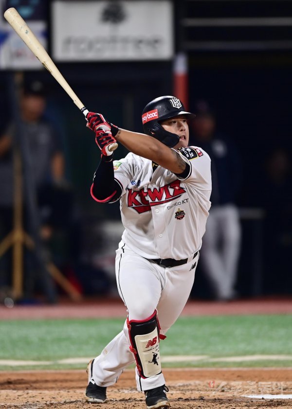 28일 경기도 수원KT위즈파크에서 열린 ‘2022 신한은행 SOL KBO리그’ KT 위즈와 두산 베어스의 경기에서 3회말 2사 KT 강백호가 우전 안타를 치고 있다.