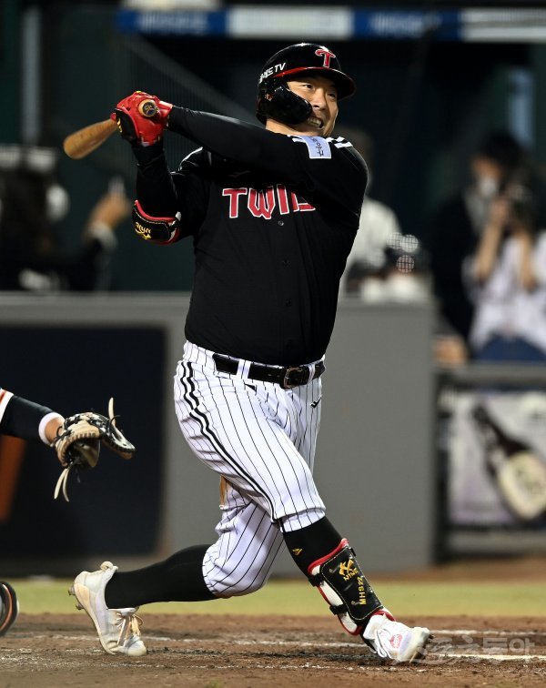 28일 대전 한화생명이글스파크에서 ‘2022 신한은행 SOL KBO리그’ 한화 이글스와 LG 트윈스의 경기가 열렸다. 5회초 2사 2루에서 LG 김현수가 1타점 2루타를 날리고 있다.