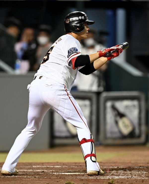28일 대전 한화생명이글스파크에서 ‘2022 신한은행 SOL KBO리그’ 한화 이글스와 LG 트윈스의 경기가 열렸다. 5회말 무사 1, 2루에서 한화 유상빈이 번트를 시도했으나 병살로 아웃되고 있다.