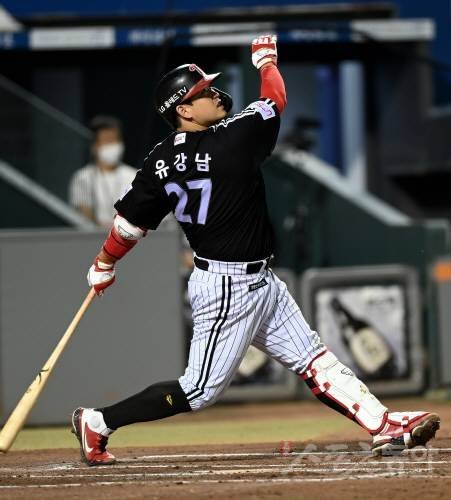 28일 대전 한화생명이글스파크에서 ‘2022 신한은행 SOL KBO리그’ 한화 이글스와 LG 트윈스의 경기가 열렸다. 6회초 1사 2, 3루에서 LG 유강남이 희생플라이를 날리고 있다.
