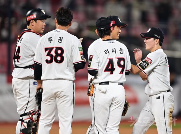 28일 경기도 수원KT위즈파크에서 열린 ‘2022 신한은행 SOL KBO리그’ KT 위즈와 두산 베어스의 경기에서 8-0으로 승리한 KT 선수들이 기쁨을 나누고 있다.