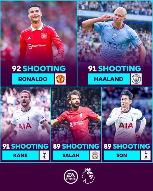 이에 따르면 맨체스터 유나이티드의 공격수 크리스티아누 호날두가 가장 뛰어난 슈팅 능력(92점)을 갖춘 것으로 나타났다. 호날두는 역대 최고의 마무리 능력을 보유했다는 평가를 받는다. 힘과 정확성은 물론 머리로도 많은 골을 넣는다