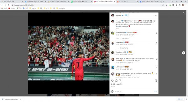 손흥민은 29일 인스타그램 계정에 “대한민국 축구 국가대표팀♥ 2경기 동안 행복한 시간 만들어주셔서 감사합니다. 더 잘 준비해서 팀으로서 선수로서 더 좋은 모습 보여드리기 위해서 노력하겠습니다. 감사합니다”라고 글을 올렸다. 이 게시물에는 불과 6시간 만에 41만 5000여 개의 \'좋아요\'가 달려 그의 인기를 실감케 했다.