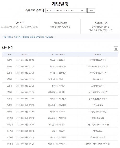 국민체육진흥공단에서 발행하는 체육진흥투표권 스포츠토토의 수탁사업자 스포츠토토코리아가 10월 1일(토)부터 3일(월)까지 열리는 잉글랜드 프리미어리그(EPL) 7경기 및 스페인 프리메라리가(라리가) 7경기 등 총 14경기를 대상으로 축구토토 승무패 51회차 게임을 발매한다.