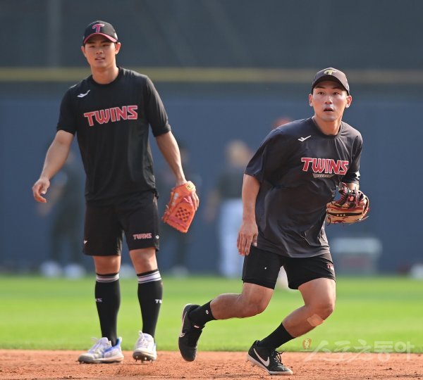 29일 서울 잠실야구장에서 열린 ‘2022 신한은행 SOL KBO리그’ LG 트윈스와 KT 위즈의 경기에 앞서 LG 서건창과 이영빈이 수비 훈련을 하고 있다.