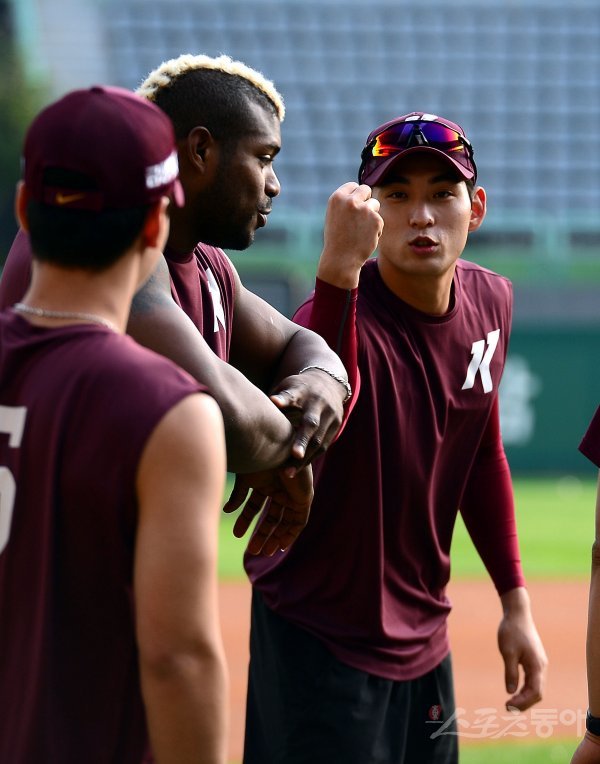 29일 인천 SSG 랜더스필드에서 ‘2022 신한은행 SOL KBO리그’ SSG 랜더스와 키움 히어로즈의 경기가 열린다. 경기 전 키움 이정후가 푸이그와 장난을 치고 있다.