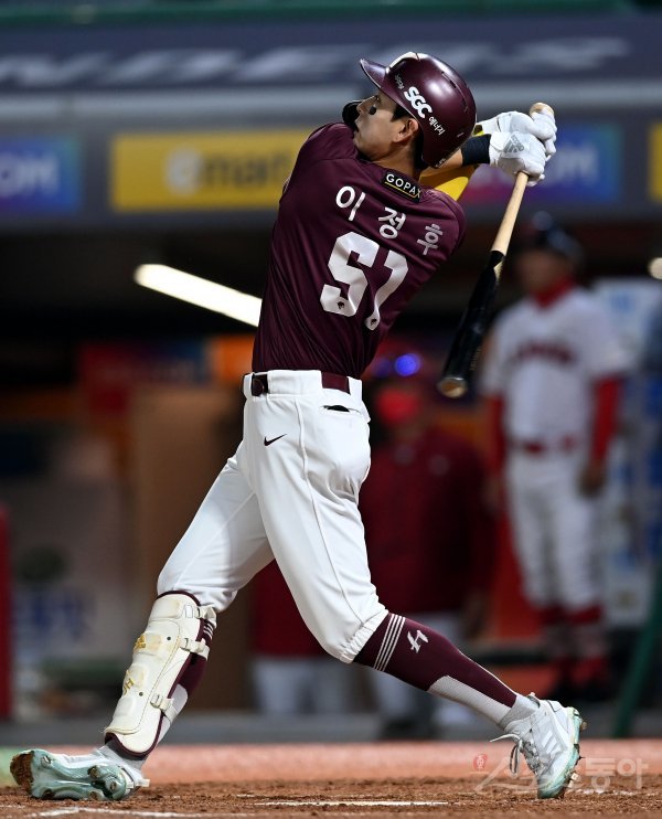 29일 인천 SSG 랜더스필드에서 ‘2022 신한은행 SOL KBO리그’ SSG 랜더스와 키움 히어로즈의 경기가 열렷다. 3회초 2사 1, 2루에서 키움 이정후가 3점 홈런을 쏘아 올리고 있다.