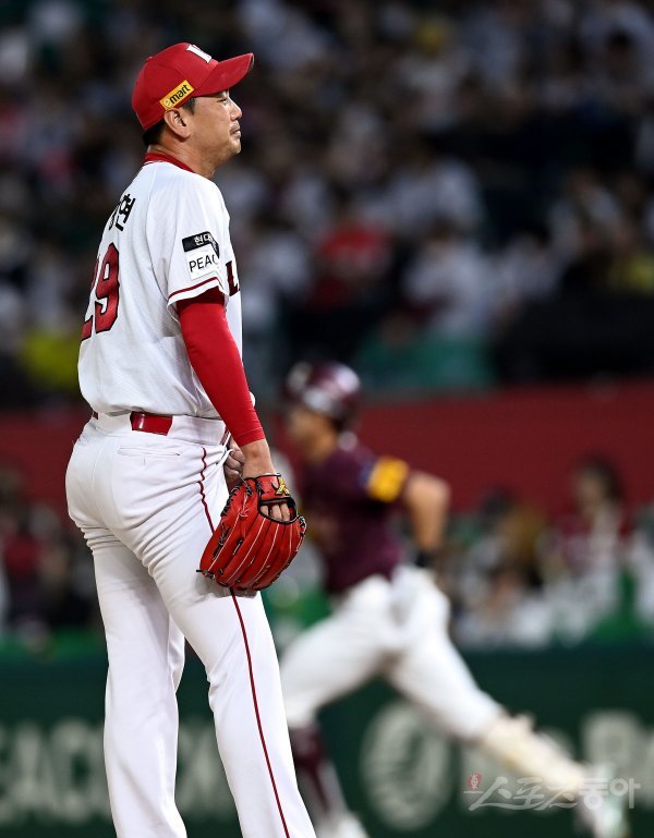 29일 인천 SSG 랜더스필드에서 ‘2022 신한은행 SOL KBO리그’ SSG 랜더스와 키움 히어로즈의 경기가 열렷다. 3회초 2사 1, 2루에서 동점 홈런을 허용한 SSG 선발 김광현이 아쉬워하고 있다.