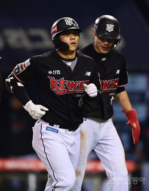29일 서울 잠실야구장에서 열린 ‘2022 신한은행 SOL KBO리그’ LG 트윈스와 KT 위즈의 경기에서 2회초 무사 1루 KT 조용호가 우월 투런 홈런을 친 후 동료의 축하를 받고 있다.