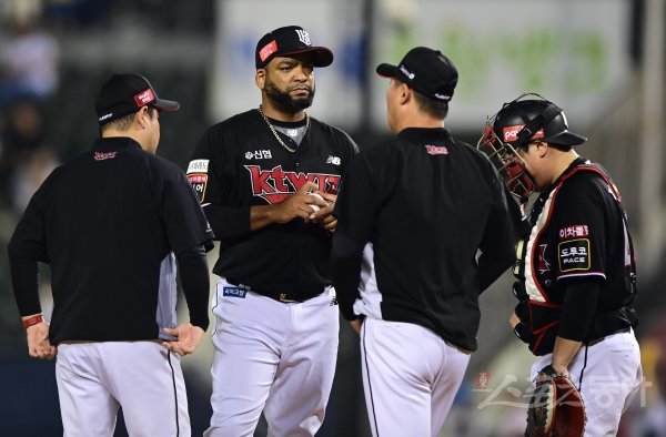 29일 서울 잠실야구장에서 열린 ‘2022 신한은행 SOL KBO리그’ LG 트윈스와 KT 위즈의 경기에서 2회말 2사 만루 LG에 실점한 KT 데스파이네가 코치와 이야기를 하고 있다.