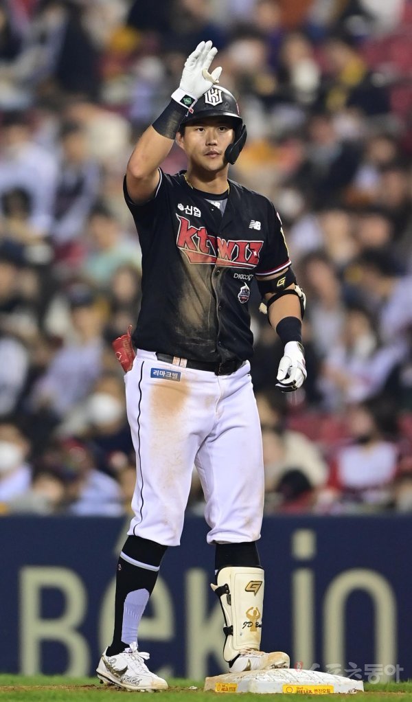 29일 서울 잠실야구장에서 열린 ‘2022 신한은행 SOL KBO리그’ LG 트윈스와 KT 위즈의 경기에서 2회초 무사 KT 배정대가 중전 안타를 친 후 더그아웃을 향해 세리머니를 하고 있다.