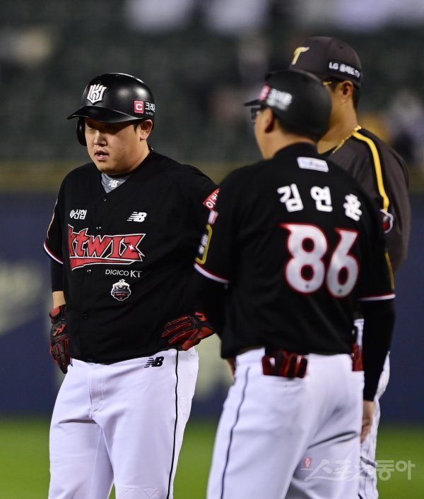 29일 서울 잠실야구장에서 열린 ‘2022 신한은행 SOL KBO리그’ LG 트윈스와 KT 위즈의 경기에서 1회초 1사 만루 KT 김준태가 내야 땅볼을 쳤지만 1루에서 세이프된 후 비디오판독 결과를 기다리고 있다.