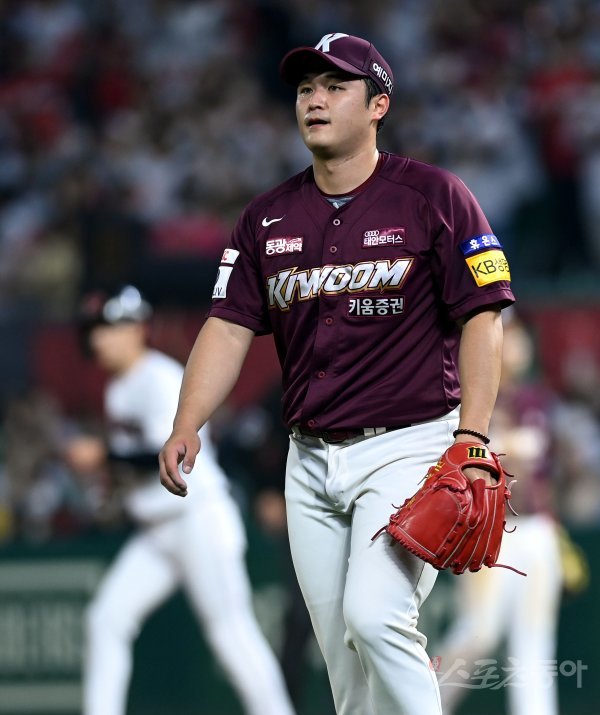 29일 인천 SSG 랜더스필드에서 ‘2022 신한은행 SOL KBO리그’ SSG 랜더스와 키움 히어로즈의 경기가 열렷다. 6회말 2사 만루에서 멀어내기 볼넷을 허용한 키움 최원태가 아쉬워하고 있다.