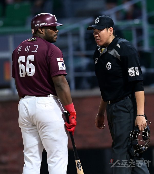 29일 인천 SSG 랜더스필드에서 ‘2022 신한은행 SOL KBO리그’ SSG 랜더스와 키움 히어로즈의 경기가 열렷다. 7회초 2사 1, 2루에서 키움 푸이그가 삼진 아웃 후 심판에게 항의하고 있다.