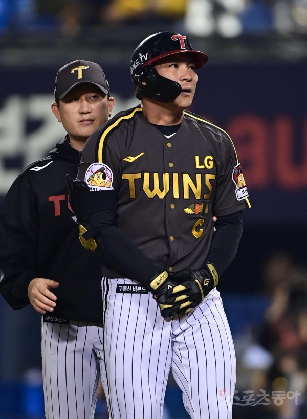 29일 서울 잠실야구장에서 열린 ‘2022 신한은행 SOL KBO리그’ LG 트윈스와 KT 위즈의 경기에서 8회말 1사 1루 LG 오지환이 투구된 볼에 맞은 후 통증을 호소하고 있다.