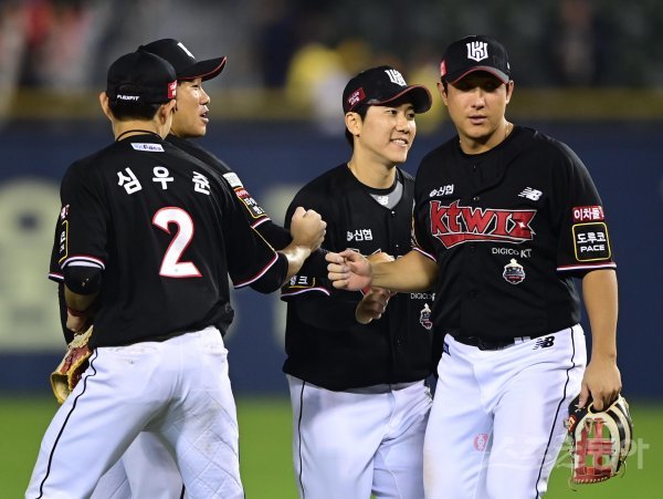 29일 서울 잠실야구장에서 열린 ‘2022 신한은행 SOL KBO리그’ LG 트윈스와 KT 위즈의 경기에서 5-3으로 승리한 KT 신본기, 오윤석, 황재균이 기쁨을 나누고 있다.