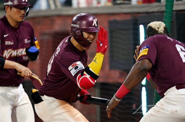 29일 인천 SSG 랜더스필드에서 ‘2022 신한은행 SOL KBO리그’ SSG 랜더스와 키움 히어로즈의 경기가 열렷다. 9회초 무사 1루에서 키움 송성문이 투런 홈런을 쏘아 올린 후 동료와 기쁨을 나누고 있다.