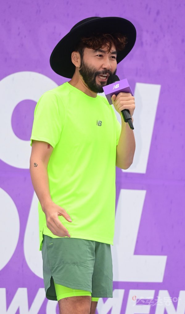 2일 서울 영등포구 여의도공원에서 열린 한 스포츠 브랜드의 러닝대회에서 방송인 노홍철이 MC를 맡아 진행하고 있다.