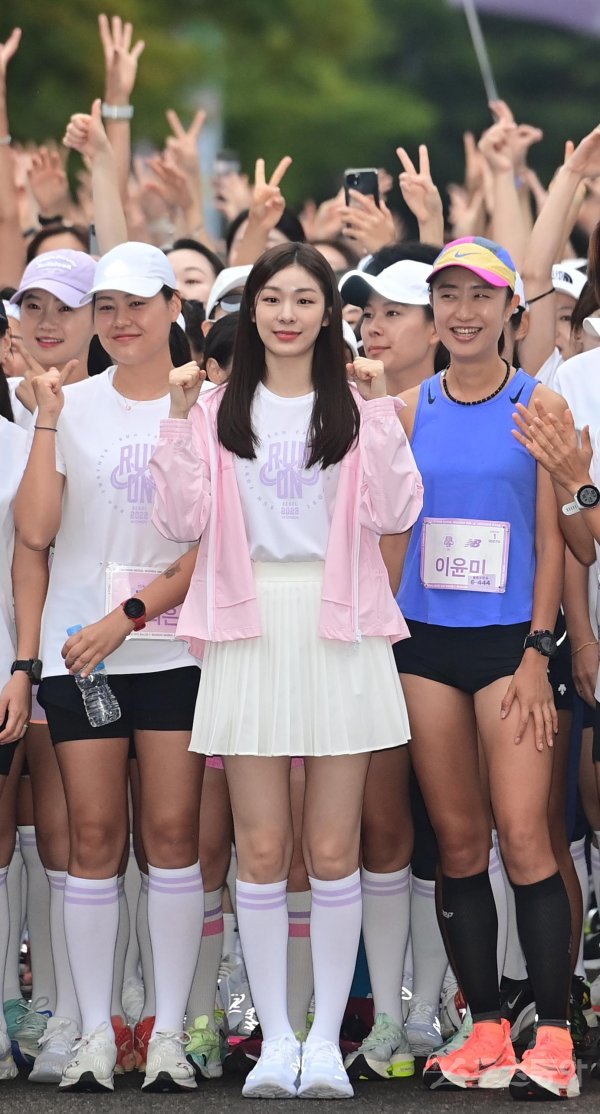 2일 서울 영등포구 여의도공원에서 열린 한 스포츠 브랜드의 러닝대회에서 전 피겨선수 김연아가 출발선에서 포즈를 취하고 있다.