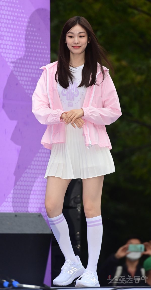2일 서울 영등포구 여의도공원에서 열린 한 스포츠 브랜드의 러닝대회에서 전 피겨선수 김연아가 무대에 오르고 있다.