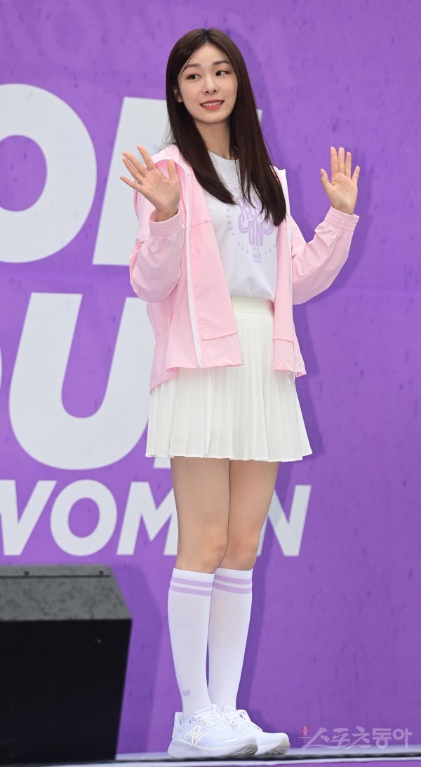 2일 서울 영등포구 여의도공원에서 열린 한 스포츠 브랜드의 러닝대회에서 전 피겨선수 김연아가 포즈를 취하고 있다.