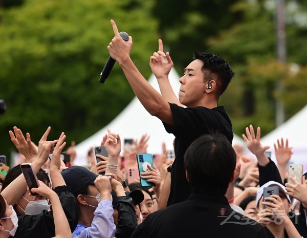 2일 서울 영등포구 여의도공원에서 열린 한 스포츠 브랜드의 러닝대회 애프터파티에서 가수 로꼬가 공연을 펼치고 있다.