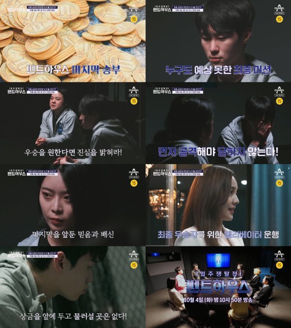 4일 방송될 ‘펜트하우스’ 예고편에서는 최종 상금을 차지할 최후의 1인을 찾기 위한 마지막 승부가 펼쳐졌다. 마지막 상금을 놓고 장명진 지반 이시윤 임현서에게 최종 미션이 주어졌고, 장명진은 “생각도 못 했던 미션이네요...”라며 탄식했다. 본격적으로 미션이 시작되자 그는 “제가 이루안 님과 서출구 님을 배신한 사람이다”라는 뜻밖의 고백에 이어 “그게 진짜 진실인지 임현서 님에게 여쭤보고 싶었다”라며 압박을 이어갔다. 소신 있는 ‘북한 남자’ 장명진은 여기서 멈추지 않고 “지반 씨는 마음에 안 들었어요. 제가 싫어하는 행동을 했어요”라며 계속되는 질문으로 상대를 곤란하게 만들었다.