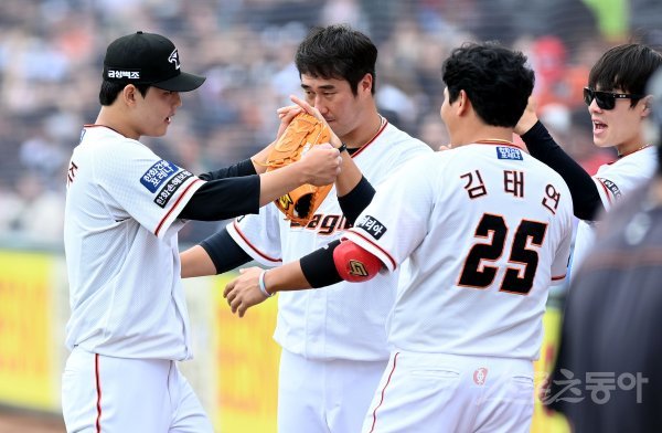 3일 대전 한화생명이글스파크에서 ‘2022 신한은행 SOL KBO리그’ 한화 이글스와 SSG 랜더스의 경기가 열렸다. 한화 선발투수 문동주가 1회초 무사 1, 3루 위기를 무실점으로 막은 후 동료들의 환영을 받고 있다.