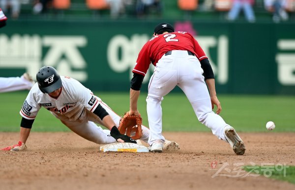 3일 대전 한화생명이글스파크에서 ‘2022 신한은행 SOL KBO리그’ 한화 이글스와 SSG 랜더스의 경기가 열렸다. 2회말 2사 1루에서 한화 정은원이 2루 도루를 성공시키고 있다.