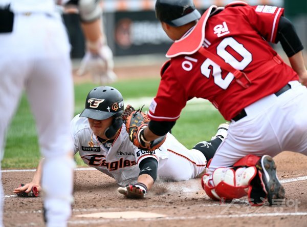 3일 대전 한화생명이글스파크에서 ‘2022 신한은행 SOL KBO리그’ 한화 이글스와 SSG 랜더스의 경기가 열렸다. 1회말 2사 1, 3루에서 한화 3루 주자 장운호가 이중도루 때 홈으로 파고들다 SSG 이재원에게 태그 아웃되고 있다.