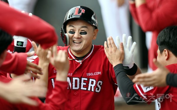 3일 대전 한화생명이글스파크에서 ‘2022 신한은행 SOL KBO리그’ 한화 이글스와 SSG 랜더스의 경기가 열렸다. 3회초 무사 1루에서 SSG 최주환이 투런 홈런을 쏘아 올린 후 동료들의 환영을 받고 있다.