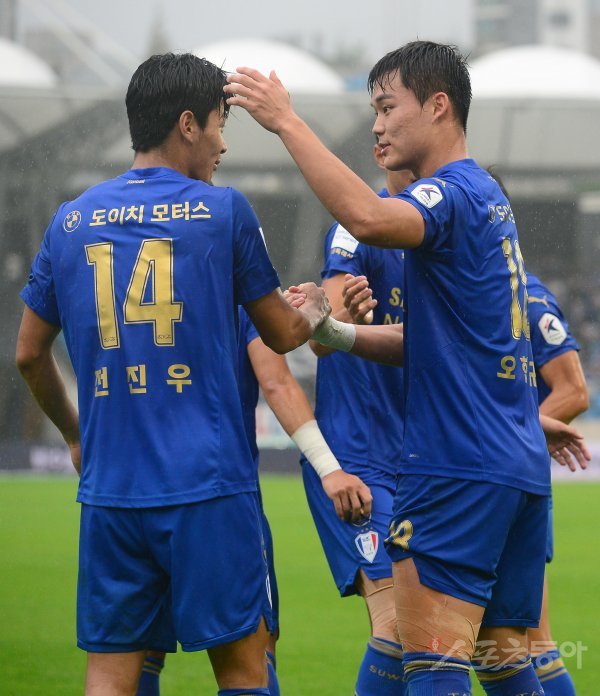 3일 경기도 탄천종합운동장에서 열린 ‘하나원큐 K리그1 2022’ 성남 FC와 수원 삼성의 경기에서 수원 오현규가 선제골을 성공한 후 동료와 기쁨을 나누고 있다.