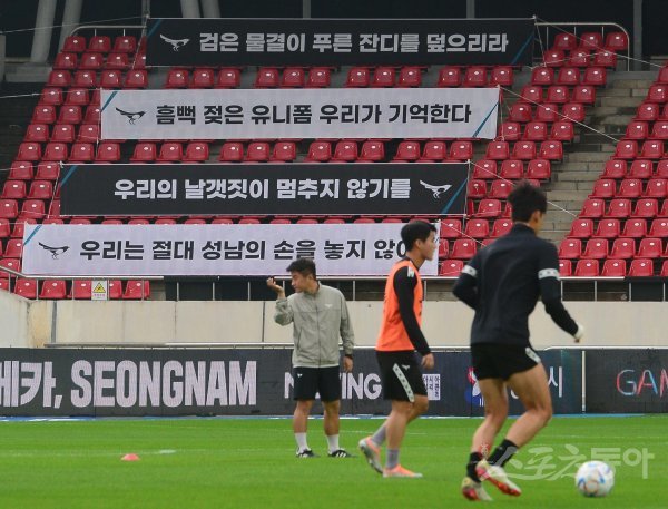 3일 경기도 탄천종합운동장에서 열린 ‘하나원큐 K리그1 2022’ 성남 FC와 수원 삼성의 경기에서 강등 위기에 처한 성남 팬들이 응원 플래카드를 설치했다.