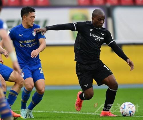 3일 경기도 탄천종합운동장에서 열린 ‘하나원큐 K리그1 2022’ 성남 FC와 수원 삼성의 경기에서 성남 팔라시오스가 수원 이기제 앞에서 슈팅을 하고 있다.