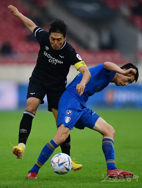3일 경기도 탄천종합운동장에서 열린 ‘하나원큐 K리그1 2022’ 성남 FC와 수원 삼성의 경기에서 성남 권순형과 수원 이종성이 몸싸움을 하고 있다.