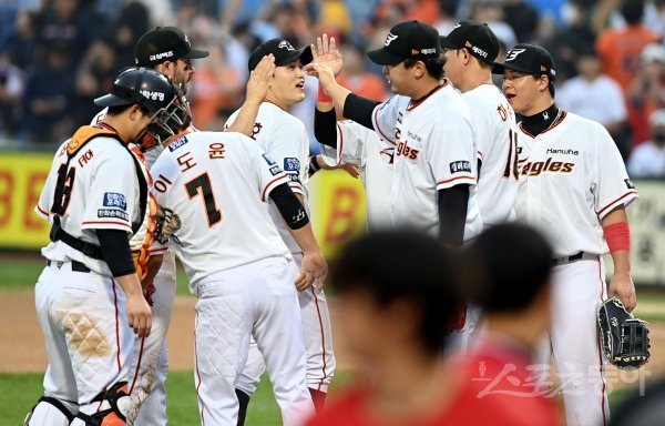 3일 대전 한화생명이글스파크에서 ‘2022 신한은행 SOL KBO리그’ 한화 이글스와 SSG 랜더스의 경기가 열렸다. 한화가 SSG를 상대로 7-4로 승리한 후 선수들이 그라운드에서 기쁨을 나누고 있다.