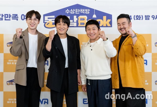 차태현, 조세호, 이석훈, 박상영이 4일 오후 진행된 ENA 여행 예능 ‘수상한책방 동서남Book’ 제작발표회에서 포즈를 취하고 있다.