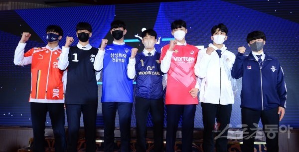 4일 서울 강남구 청담 리베라 호텔에서 열린 2022~2023 KOVO 남자 신인선수 드래프트에서 1라웆드 지명 선수들이 기념촬영을 하고 있다. 왼쪽부터 신호진(OK금융그룹), 이현승(현대캐피탈), 김준우(삼성화재), 한태준(우리카드), 김주영(한국전력), 박현빈(KB손해보험), 송민근(대한항공).