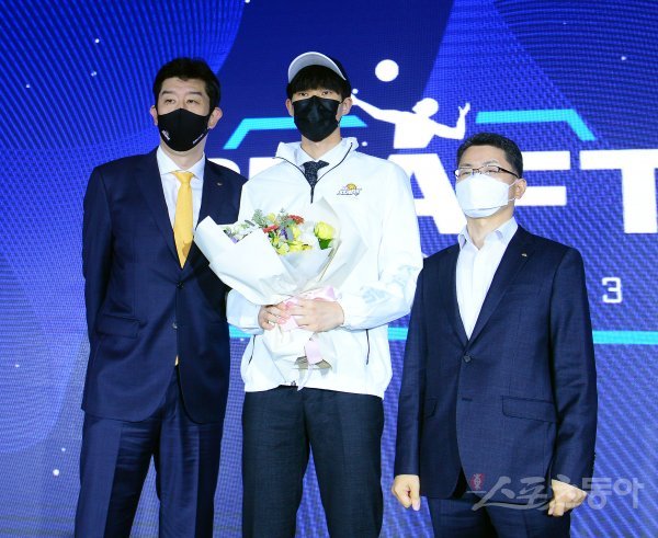4일 서울 강남구 청담 리베라 호텔에서 열린 2022~2023 KOVO 남자 신인선수 드래프트에서 4라운드 2순위로 KB손해보험에 지명된 최요한이 후인정 감독과 기념촬영을 하고 있다.